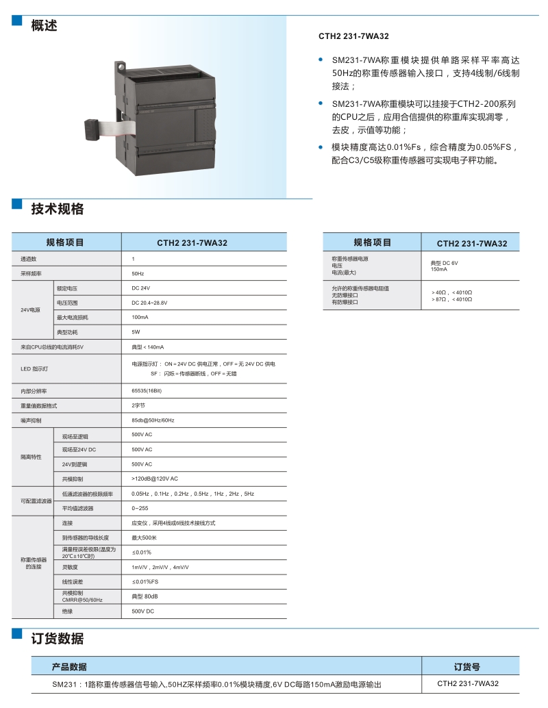 SM231 重模塊 | 稱重模塊,1路傳感器信輸入,采樣頻率50Hz,0.01%模塊精度,6VDC每路150MA激勵(lì)電源輸出,隔離型16位精度 | CTH2 231-7WA32 |