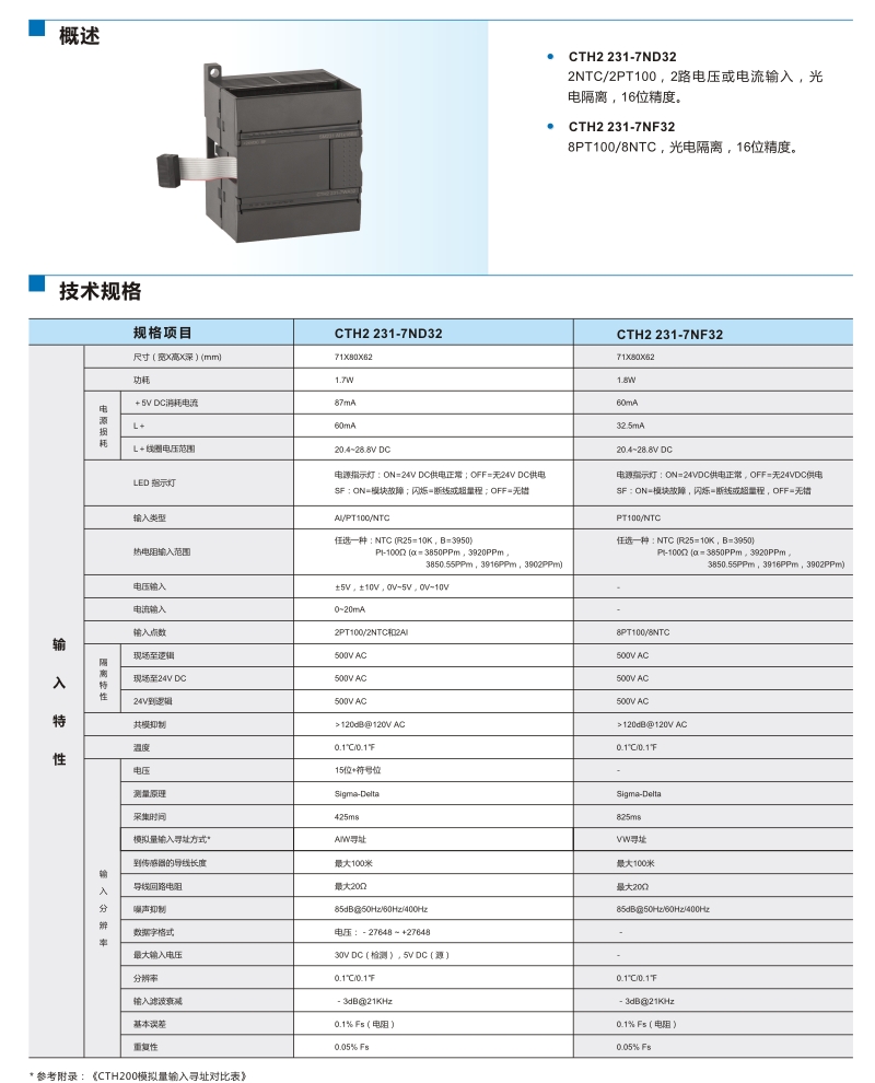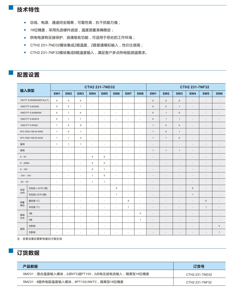 | SM 231:混合溫度輸入模塊,2點(diǎn)NTC或PT100,2點(diǎn)0~20mA電流或±5V,±10V,0~10V,0~5V電壓輸入,隔離型16位精度 | CTH2 231-7ND32 |