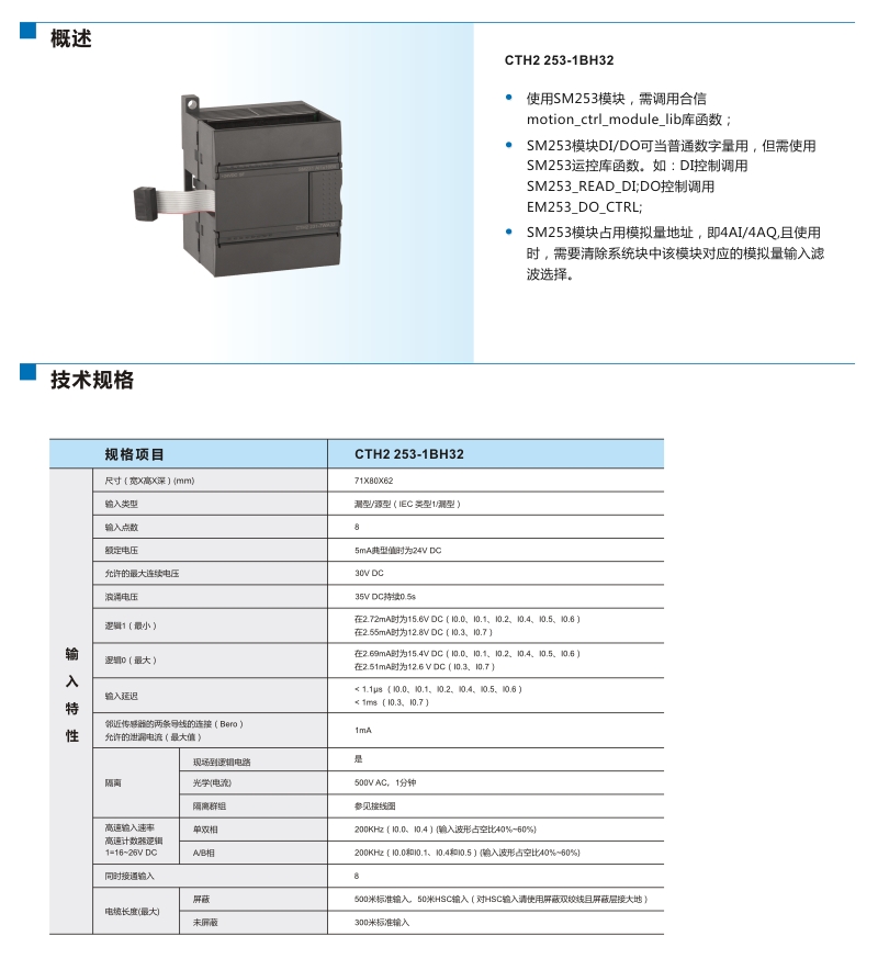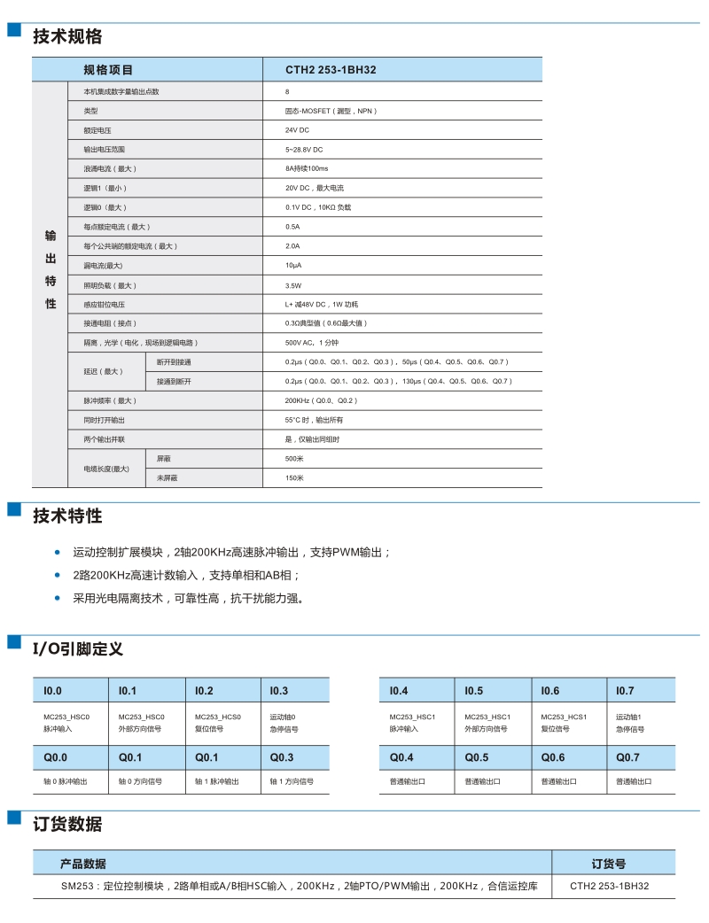 SM253 定位控制模塊 | 定位控制模塊,2路單相或AB相HSC輸入,200KHz,2軸PTO/PWM輸出,200KHz,合信運動控制庫 | CTH2 253-1BH32 |